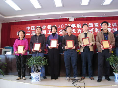 本報(bào)訊 日前,在云南省大理市召開的中國工業(yè)報(bào)社2007年度新聞宣傳培訓(xùn)班暨第三屆中國工業(yè)企業(yè)優(yōu)秀報(bào)刊和好新聞?lì)I(lǐng)獎(jiǎng)大會(huì)上,我《杭機(jī)集團(tuán)報(bào)》被評(píng)為中國工業(yè)企業(yè)2007年度優(yōu)秀報(bào)刊一等獎(jiǎng),其獲獎(jiǎng)?wù)Z是:欄目豐富、形式活潑、文章短小精悍,并出版中德雙語報(bào),便于外籍專家了解企業(yè)動(dòng)態(tài)。本報(bào)記者陳烈新采寫的《首席工程師加冕儀式在中科院杭州科技園舉行》報(bào)道,榮獲好新聞(消息)評(píng)選二等獎(jiǎng),這反映了我集團(tuán)重視人才隊(duì)伍建設(shè)引起了媒體的關(guān)注和肯定。集團(tuán)公司黨委書記董事長朱金根獲悉,當(dāng)即給出席頒獎(jiǎng)會(huì)的主編王忠民發(fā)賀訊:“祝賀你,并與你們共享榮譽(yù)和喜悅!”