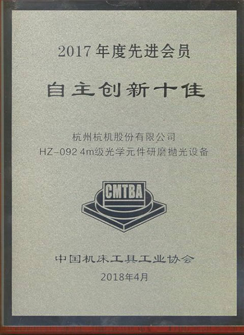 2018年4月,中國(guó)機(jī)床工具工業(yè)協(xié)會(huì)開展了2017年度中國(guó)機(jī)床工具工業(yè)協(xié)會(huì)先進(jìn)會(huì)員(十佳)表彰活動(dòng),我公司憑借“HZ-092 4米級(jí)光學(xué)元件研磨拋光設(shè)備”項(xiàng)目榮獲2017年度中國(guó)機(jī)床工具工業(yè)協(xié)會(huì)“自主創(chuàng)新十佳”稱號(hào)。