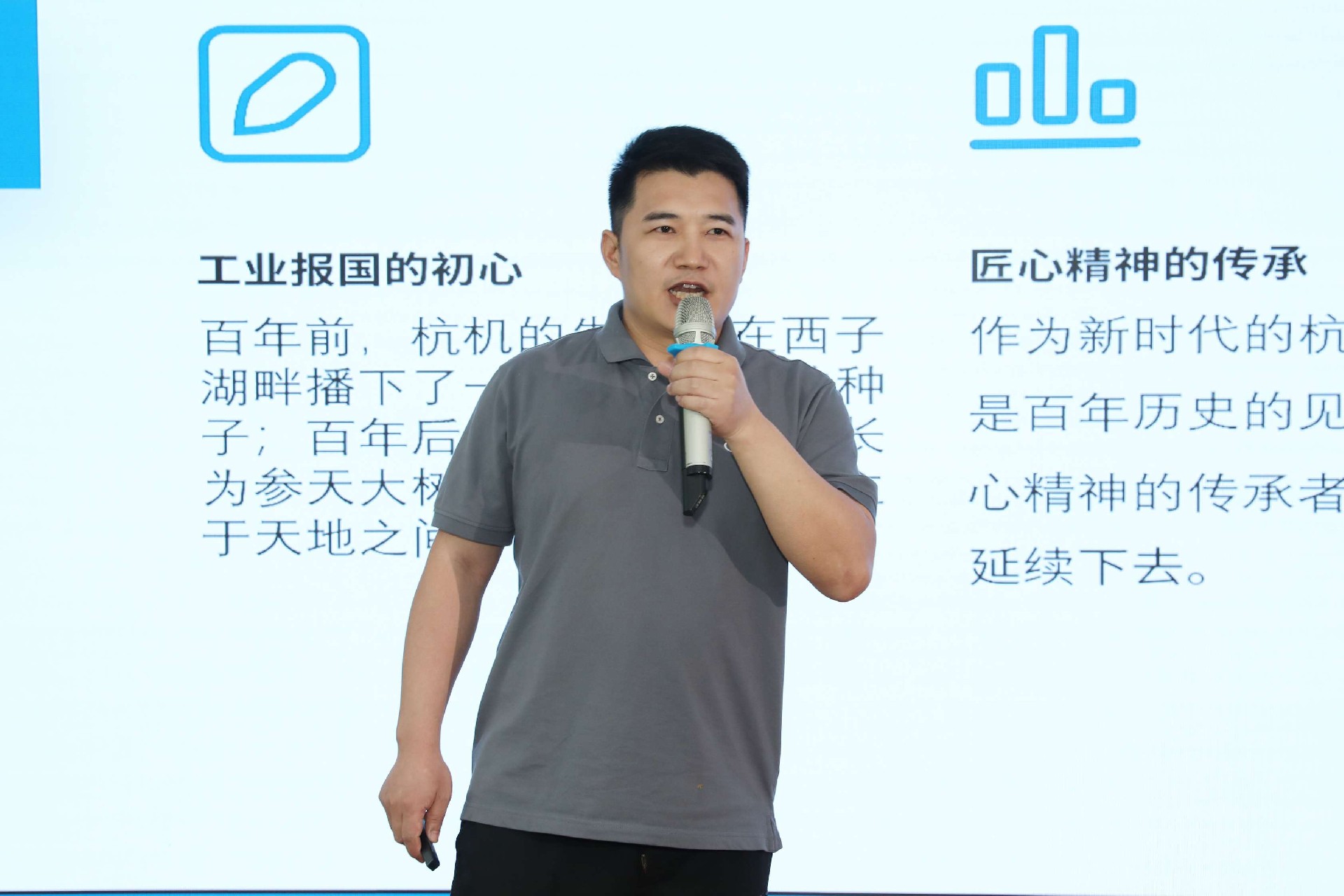 決賽現(xiàn)場,16名來自不同崗位的參賽選手依次登臺。他們中既有扎根車間三十載的老技工,也有青年研發(fā)工程師,更有新入職就感受到滿滿杭機力量的新員工。演講內(nèi)容緊扣“匠心傳承”“智造突圍”“黨員先鋒”等關(guān)鍵詞,配合多媒體視聽呈現(xiàn),引發(fā)陣陣掌聲。